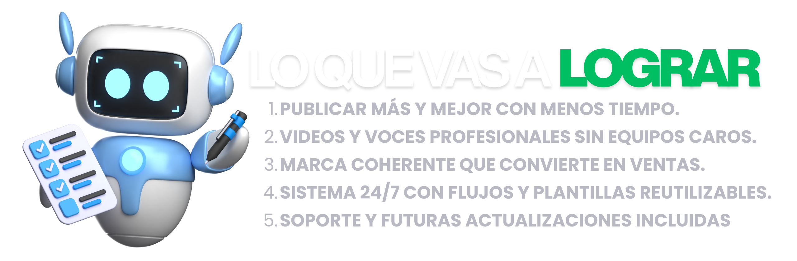1- Planifica y organiza ideas de contenido en minutos con plantillas personalizables.2- Genera guiones, captions y copys profesionales en segundos usando IA adaptada a tu voz de marca.3- Crea gráficos, videos y diseños impactantes con herramientas intuitivas y sin curva de aprendizaje.4- Publica de forma consistente y maximiza tu visibilidad sin invertir horas extras cada semana.